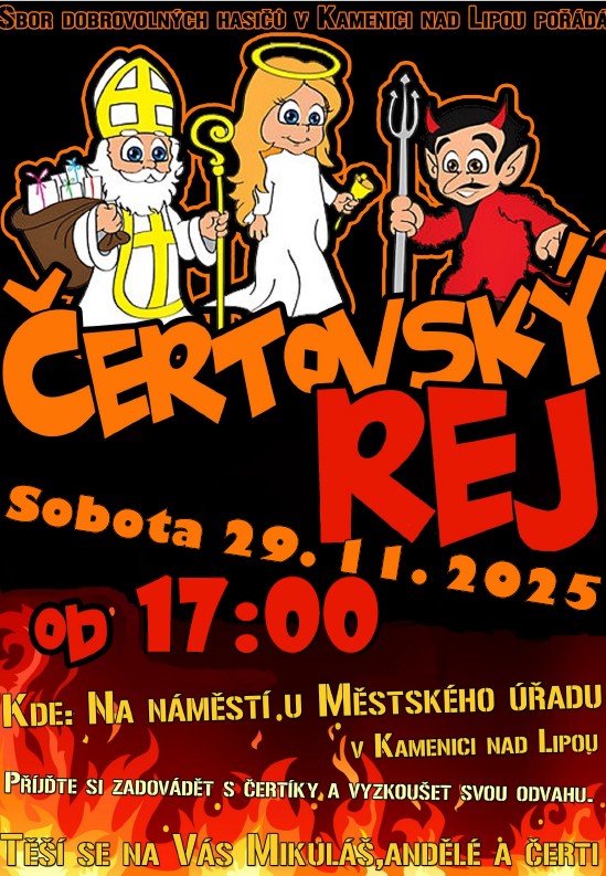 Sbor dobrovolných hasičů v Kamenici nad Lipou zve všechny děti i dospělé na tradiční Čertovský rej, který se uskuteční v sobotu 29. listopadu 2025 od 17:00 na náměstí u Městského úřadu.